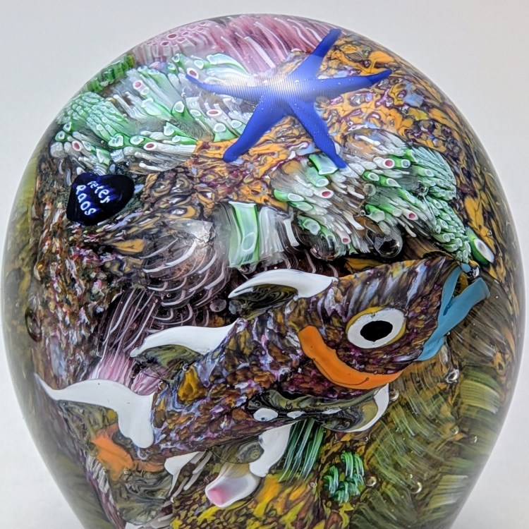 These pieces capture the beauty of the underwater reef using the most advanced glass cane techniques. Included is a “signature cane” which spells out the artist’s name in glass. Peter made these special canes to include in a selection of pieces to celebrate 40 years of glass artistry. A very collectable item.